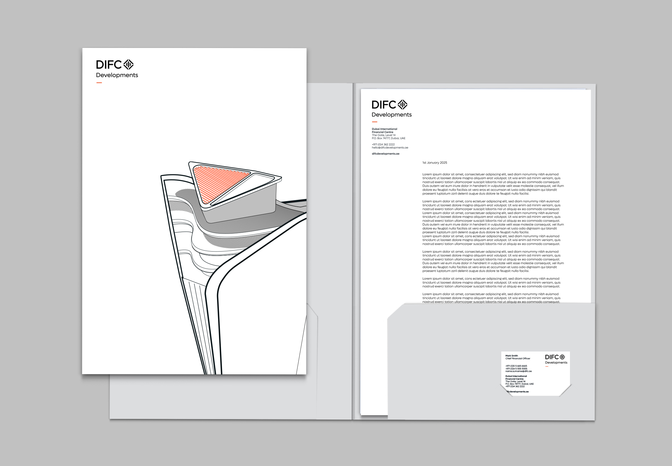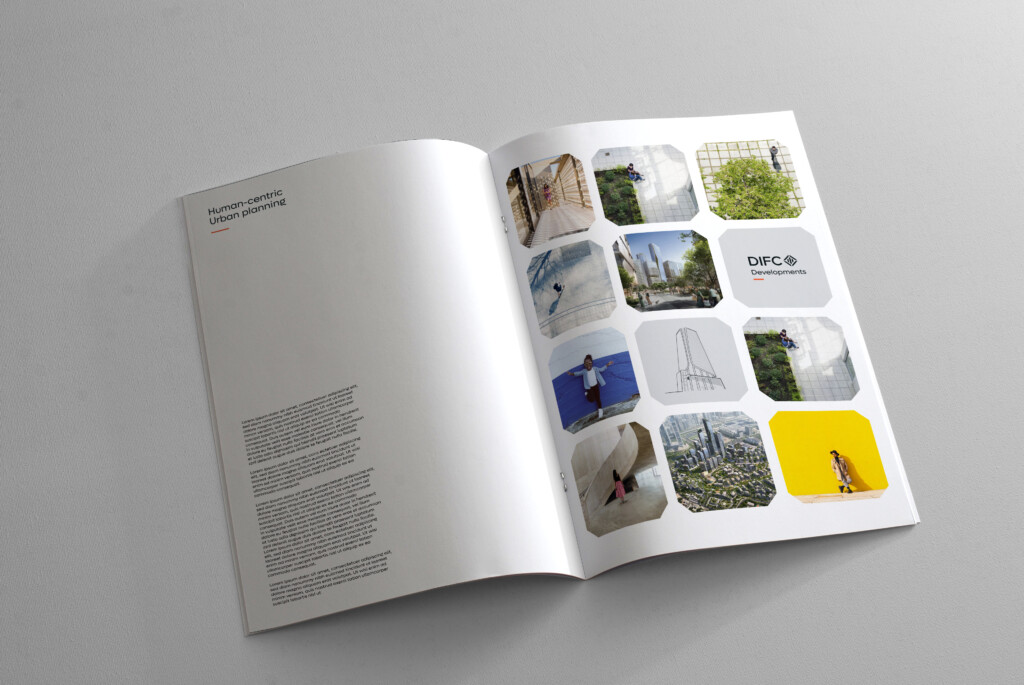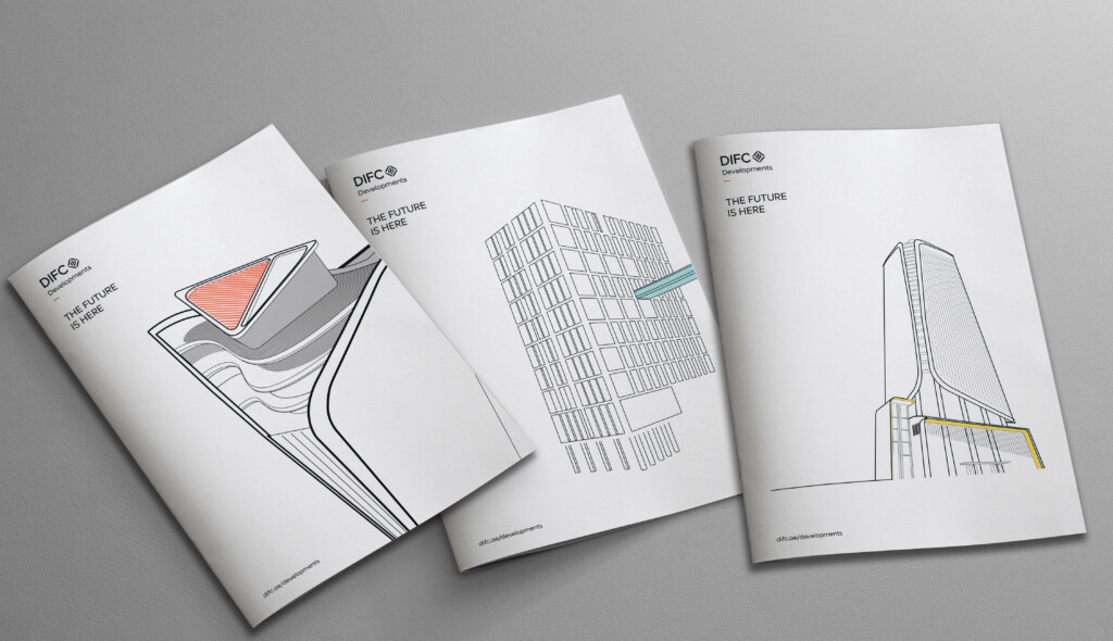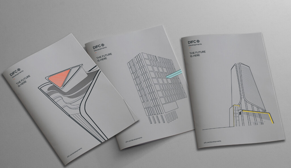 This is a notional example of DIFC Developments folder. When creating artworks it is permissible for use of special printing techniques such as varnishes or foils as deemed necessary.