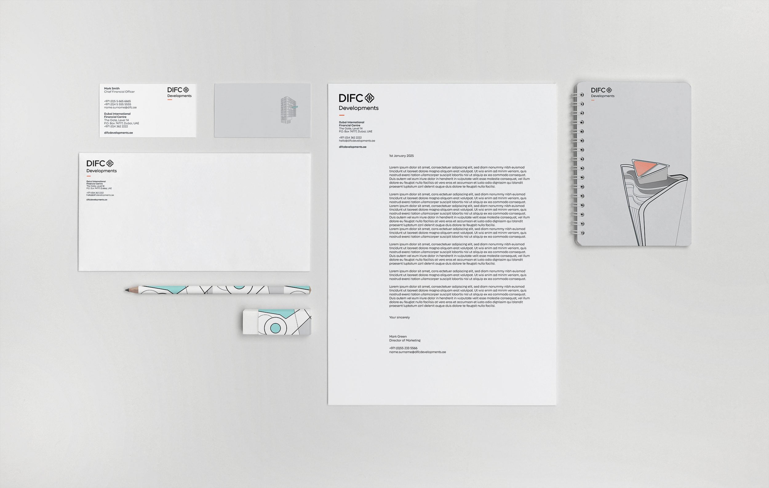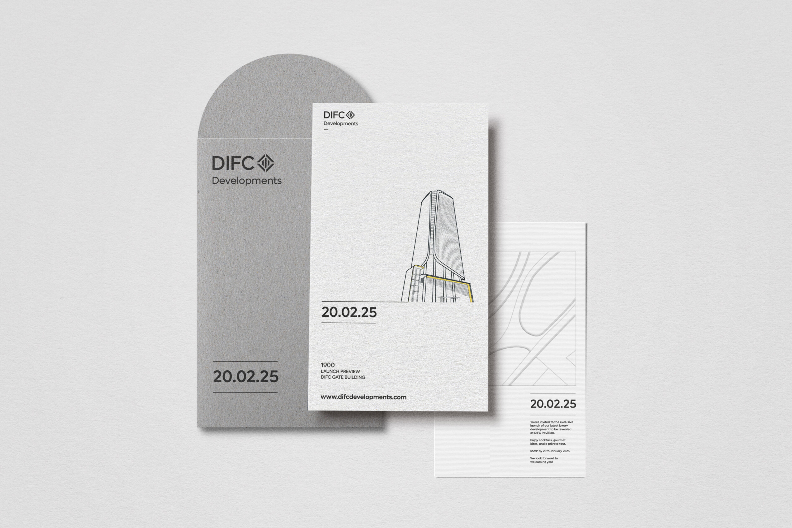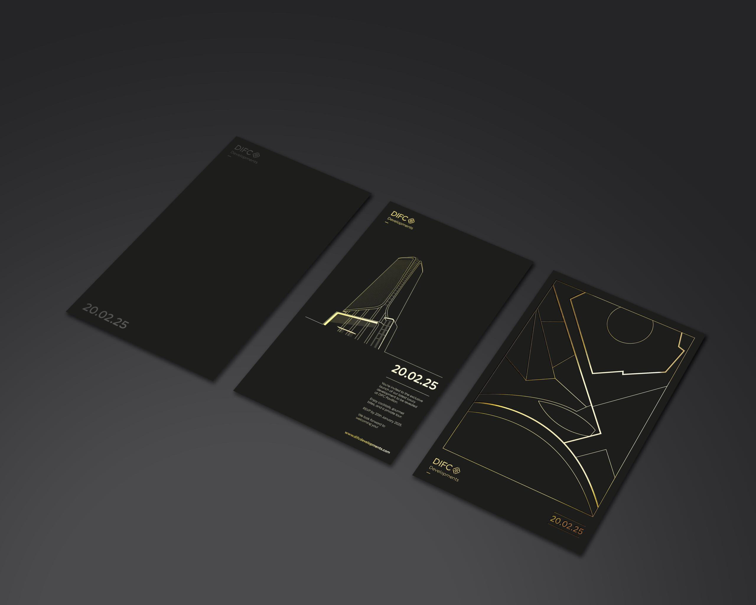 This is a notional example of DIFC Developments folder. When creating artworks it is permissible for use of special printing techniques such as varnishes or foils as deemed necessary.
