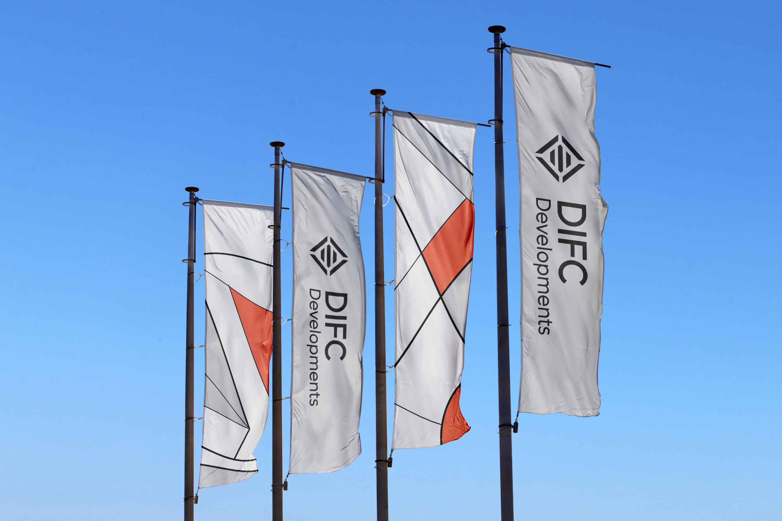 The following are examples of the DIFC Developments flag banners. Flag banners are shown utilising the the primary brandmark (excluding the orange extension line). This is permissible across space restricted applications/